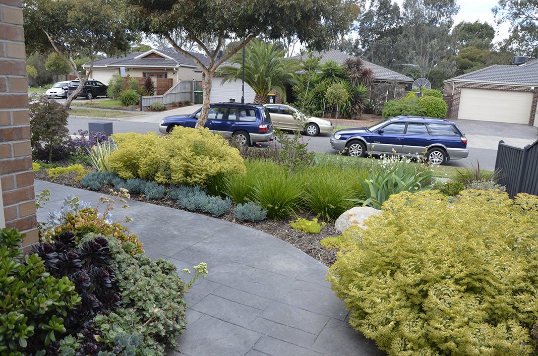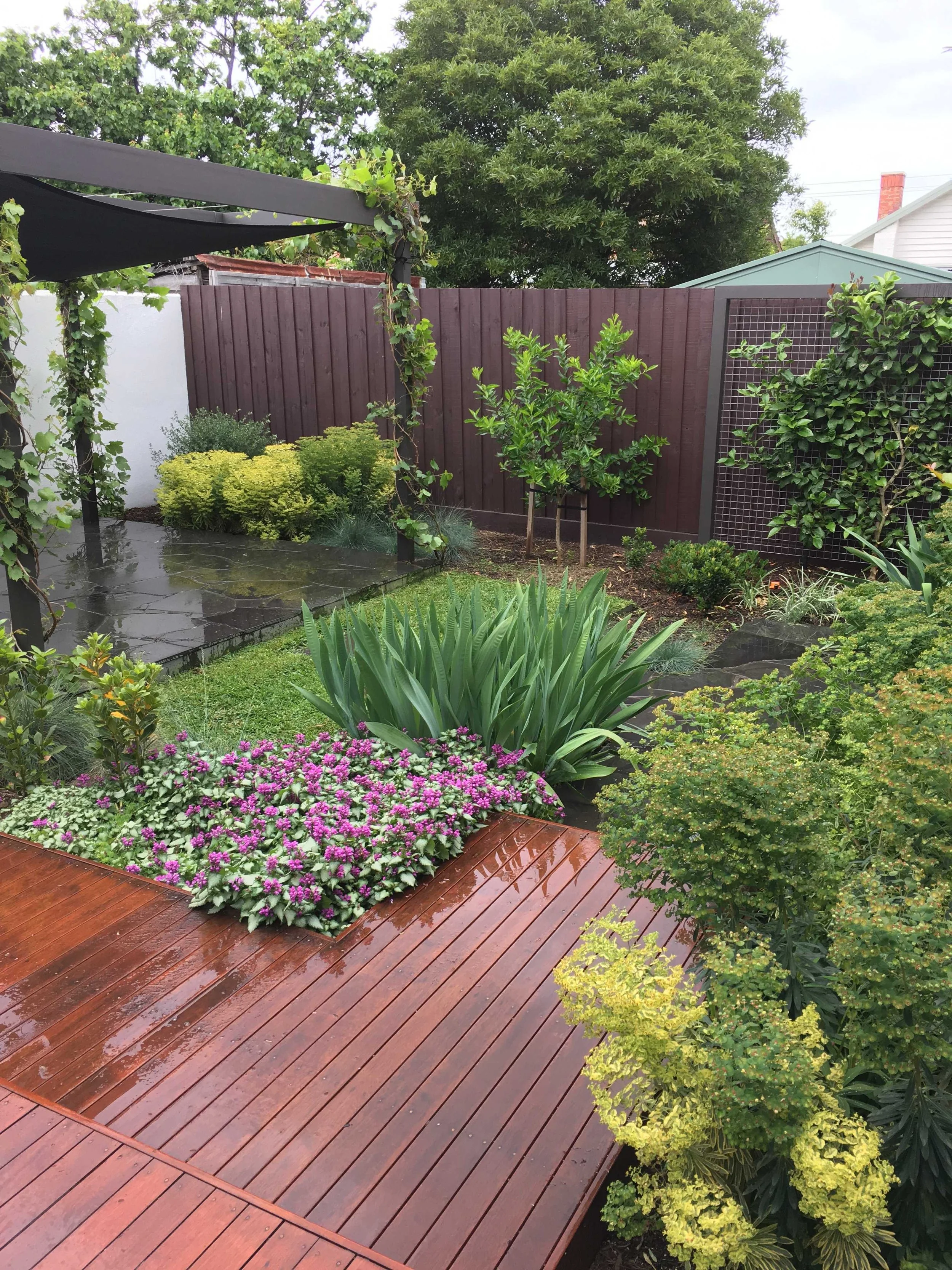 This garden in West Brunswick is a contemporary perennial flowering garden with a productive garden in the front and a relaxing space in the rear. The front features easy to access wicking beds for vegetables and herbs and a dwarf lemon tree in a large pot.